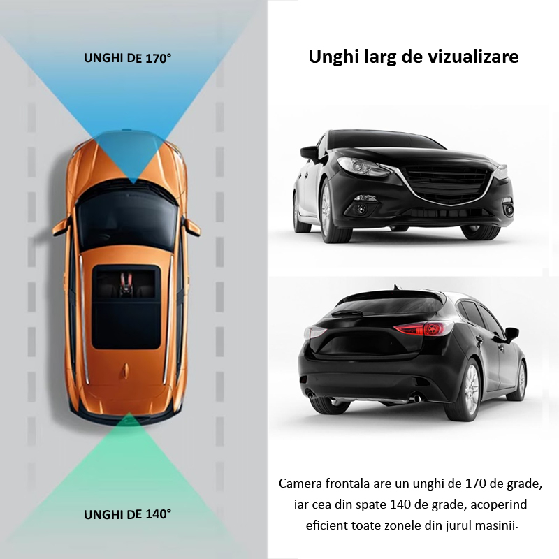 Echipata cu functie de vedere nocturna performanta si unghiuri largi de vizualizare (170° frontal si 140° posterior), aceasta camera auto surprinde actiunea sigura si detaliata ziua si noaptea. Unghiul extins ajuta la monitorizarea completa a mediului in care te afli.